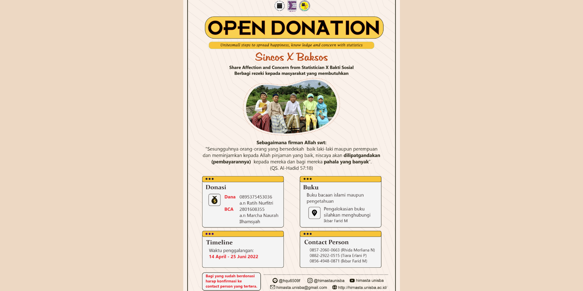 Himasta Unisba kali ini mengadakan kegiatan SincosxBaksos. Sincos (Share Affection and Concern From Statistician) merupakan kegiatan sosial untuk menebarkan kebaikan bagi masyarakat, Baksos (Bakti Sosial) yang mana kegiatan tersebut merupakan bentuk kepedulian dari seorang mahasiswa kepada masyarakat.