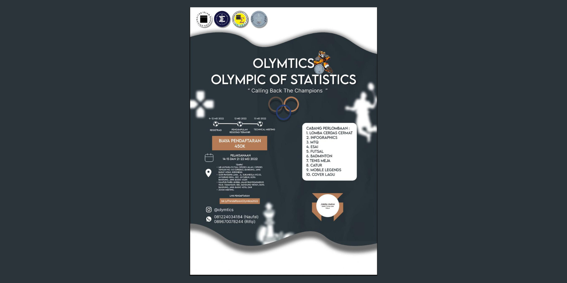 sebagai upaya untuk meningkatkan keseimbangan antara akademik dan non-akademik banyak kegiatan yang dapat dilakukan, salah satunya dengan diadakannya kegiatan perlombaan yang dapat menghimpun dua hal tersebut. berkaitan dengan hal tersebut, Himpunan Mahasiswa Statistika Universitas Islam Bandung dituntut untuk menghimpun seluruh Keluarga Statistika Unisba agar berperan aktif dalam upaya meningkatkan keseimbangan akademik dan non-akademik seluruh Keluarga Statistika Unisba. Bidang Seni dan Olahraga, Bidang Rohani Islam, dan Bidang Pengembangan Potensi Akademik bekerja sama dan bertanggung jawab melaksanakan program kerja dengan baik dan bertugas sebagai fasilitator bagi Mahasiswa Statistika Unisba di Bidang Seni dan Olahraga, peningkatan potensi akademik di Bidang Rohani Islam dan Bidang Pengembangan Potensi Akademik sekaligus mempererat tali silaturahmi antar warga Statistika Unisba