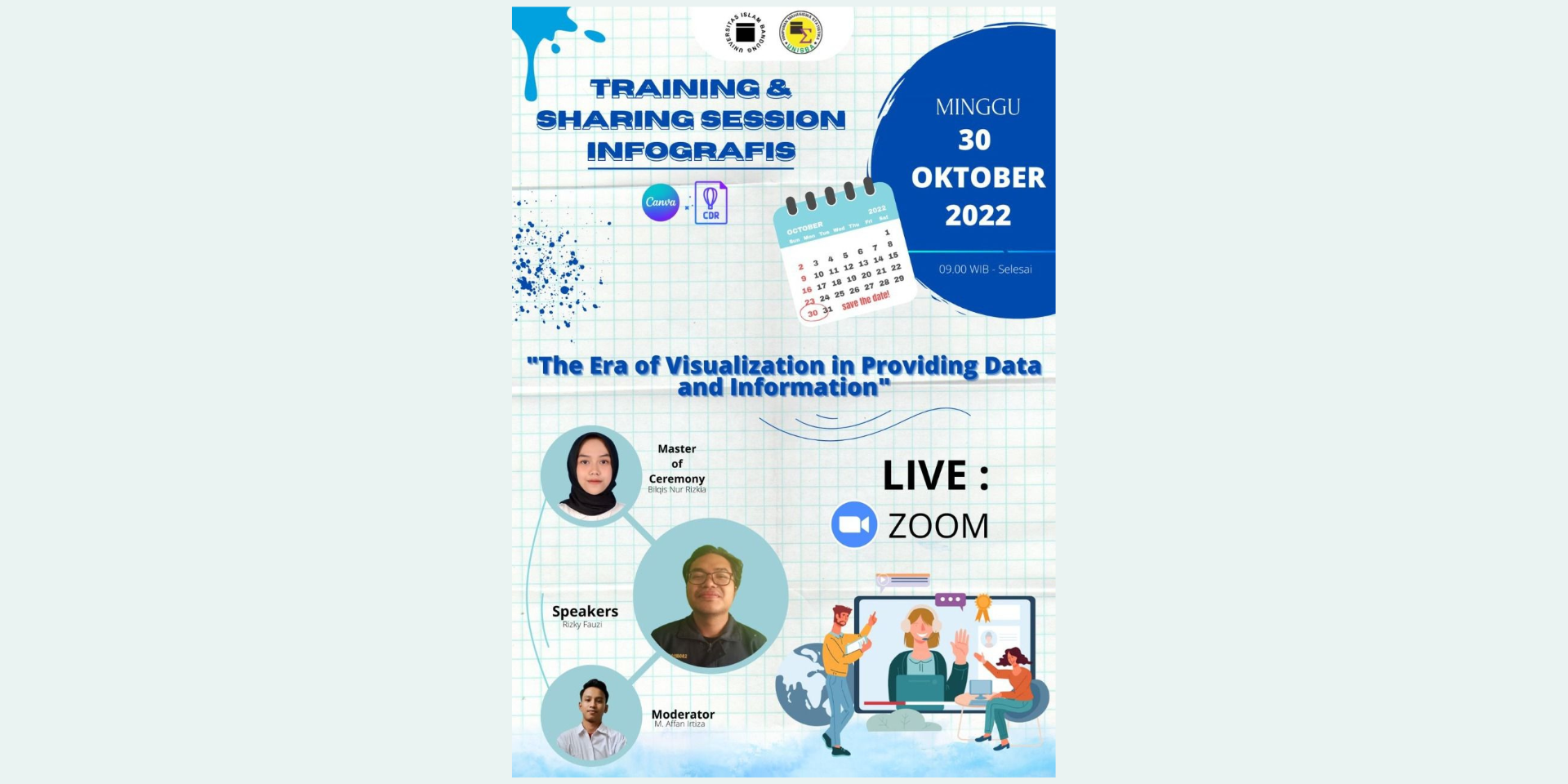 Pada pelatihan infografis yang pertama dari aktivitas kerja infografis ini mengusung tema “The Era of Visualization in Providing Data and Information” dengan menggunakan aplikasi yang sudah banyak dikenali khalayak umum, yaitu aplikasi yang bernama Canva. Teknis pelaksanaannya dilakukan secara online melalui zoom meeting pada tanggal 30 Oktober 2022 dari pukul 09.00-11.30 WIB yang disampaikan oleh Rizky Fauzi, seorang mahasiswa Statistika Unisba Angkatan 2018 sebagai pematerinya, dan dihadiri oleh mahasiswa aktif Statistika Unisba yang berjumlah 76 peserta.