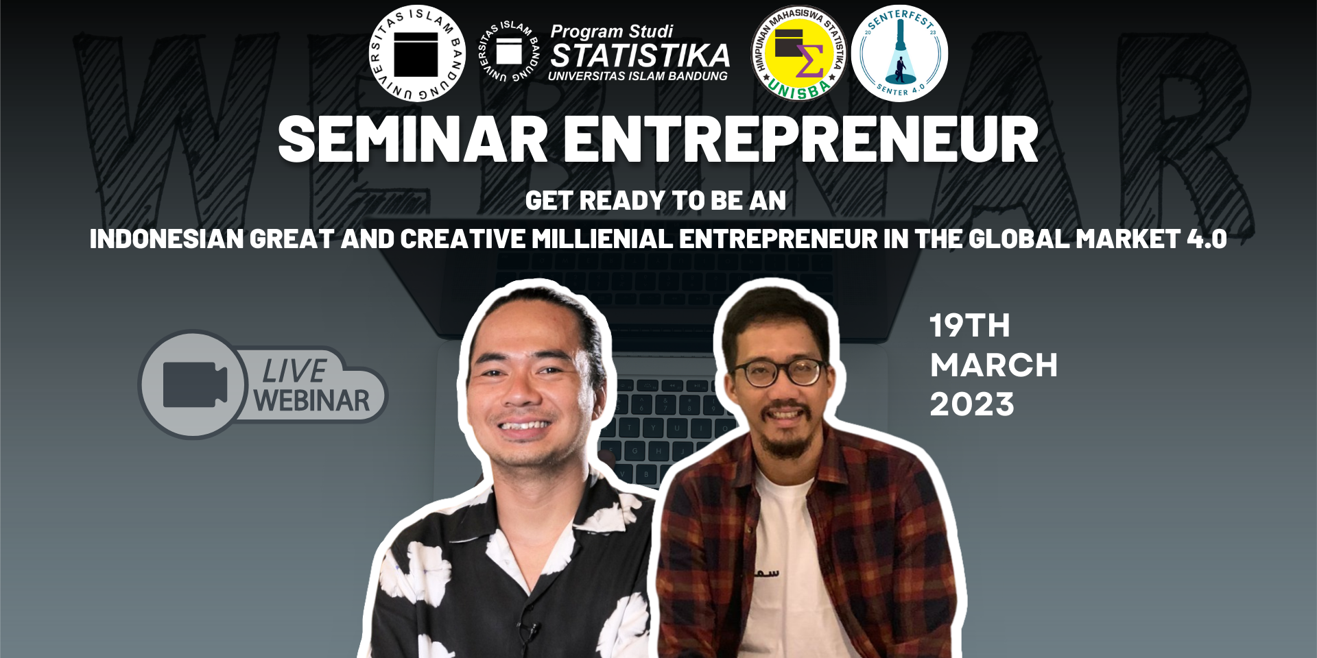 Seminar Entrepreneur merupakan salah satu program kerja dari Bidang Badan Usaha Himpunan Mahasiswa Statistika Universitas Islam Bandung yang memiliki tujuan untuk memperkenalkan dan memberi pengetahuan mengenai kewirausahaan kepada masyarakat umum. Seminar Entrepreneur ini rutin dilaksanakan setiap tahun. Pada tahun ini, Seminar Entrepreneur mengusung tema yaitu “Get Ready To Be an Indonesian Great Creative Millennial Entrepreneur in The Global Market 4.0”. Selaras dengan tujuannya, tema ini diambil karena perkembangan bisnis di masa kini sangat cepat, terutama dengan berkembangnya dunia online sehingga muncul frasa baru yaitu “Global Market 4.0”.