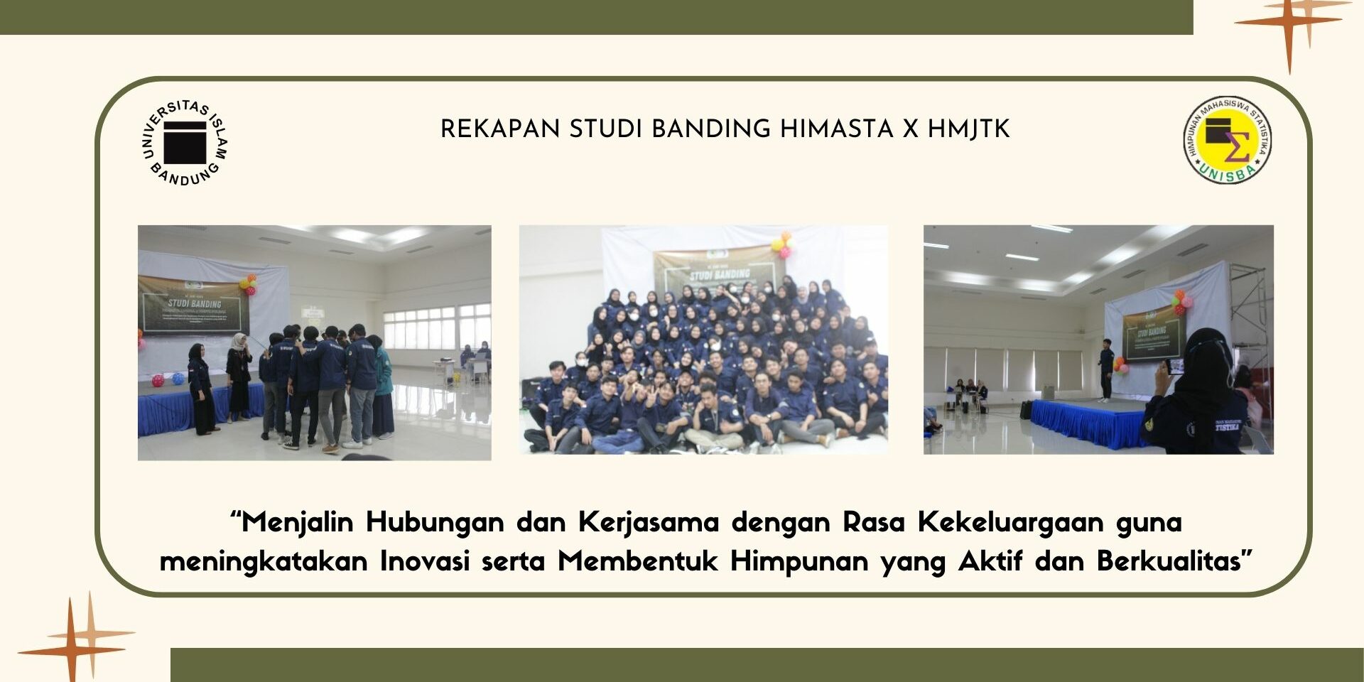 Oleh karena itu, Himpunan Mahasiswa Statistika (HIMASTA) Unisba mengadakan studi banding dengan Himpunan Mahasiswa Jurusan Teknik Kimia (HMJTK) Polban pada Sabtu, 10 Jumi 2023. Studi banding yang diinisiasi dengan tajuk “Menjalin Hubungan dan Kerjasama dengan Rasa Kekeluargaan guna meningkatakan Inovasi serta Membentuk Himpunan yang Aktif dan Berkualitas” ini dilaksanakan secara offline di gedung Pascasarjana Polban.