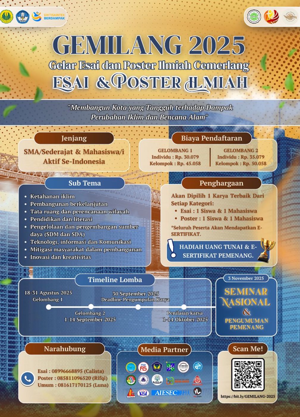 - Peserta lomba esai merupakan mahasiswa/i (D3/D4/St) aktif perguruan tinggi negeri swasta se Indonesia, dan SMA Sederajat, dengan melampirkan bukti Kartu Tanda Mahasiswa dan bukti KRS semester terbaru, untuk siswa SMA melampirkan bukti Kartu Pelajar atau Surat Keterangan Aktif Siswa.