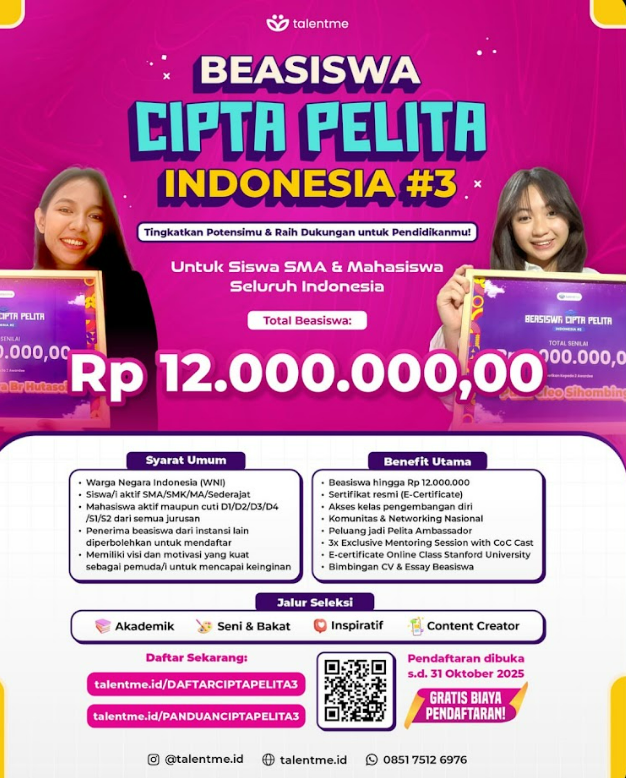 Beasiswa Cipta Pelita #3 merupakan program dari Talentme.id yang ditujukan bagi pemuda/i Indonesia yang memiliki semangat untuk belajar, bertumbuh, dan memberikan dampak positif. Program ini tidak menuntut kesempurnaan, melainkan keberanian untuk melangkah dan mengembangkan potensi diri.