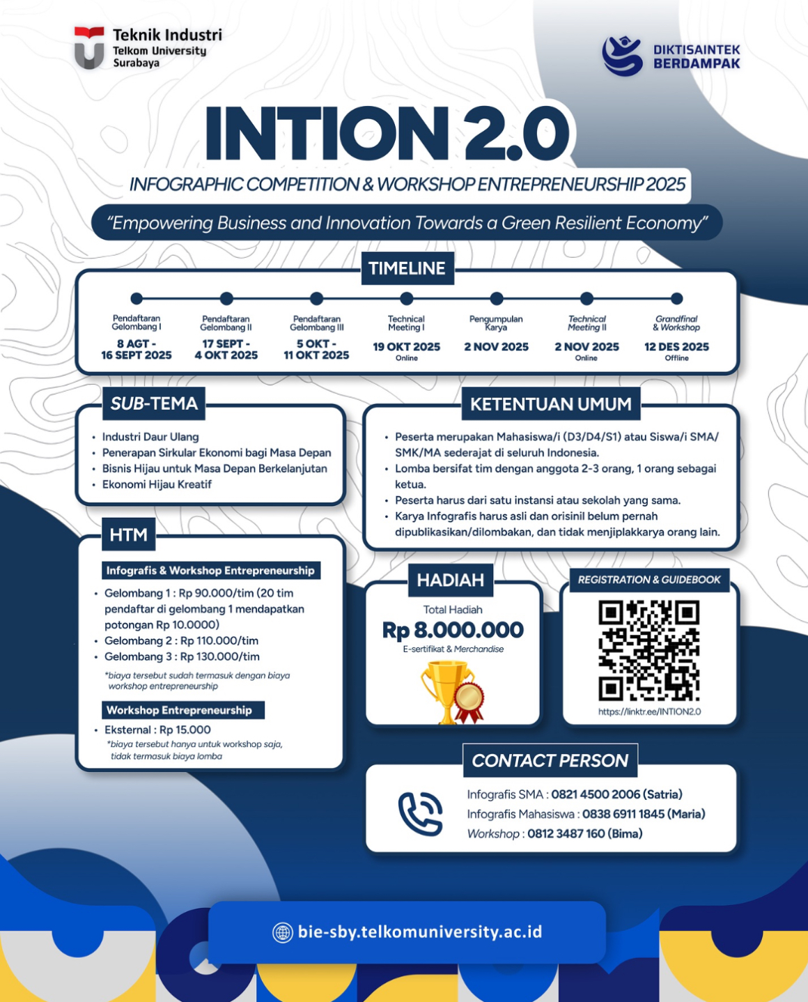 INTION 2.0 (Industrial Competition) merupakan ajang kompetisi tingkat Nasional yang diselenggarakan oleh Himpunan Mahasiswa Teknik Industri (HMTI) Telkom University Surabaya. INTION 2.0 sebagai salah satu bentuk kontribusi nyata dalam menjawab tantangan global tersebut. Kegiatan ini dirancang untuk memberikan ruang bagi mahasiswa/i serta siswa/i SMA/SMK/MA dari seluruh Indonesia dalam menyalurkan ide-ide kreatif, inovatif, dan solutif yang berorientasi pada keberlanjutan lingkungan dan sosial.