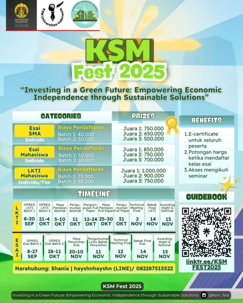 Puji syukur kita panjatkan ke hadirat Tuhan Yang Maha Esa karena berkat rahmat-Nya, kegiatan Lomba Esai KSM Fest UI 2025 dengan tema “Investing in a Green Future: Empowering Economic Independence through Sustainable Solutions” dapat terlaksana.