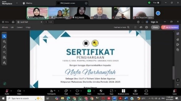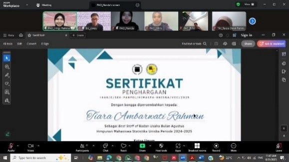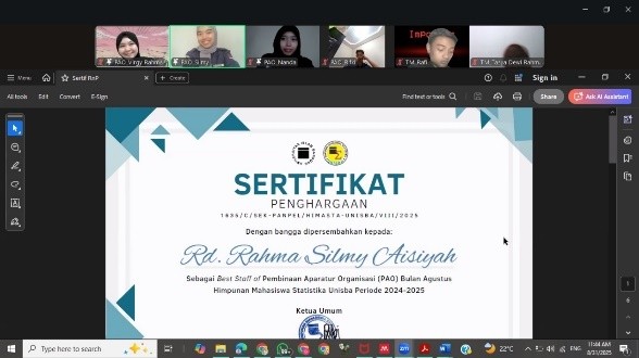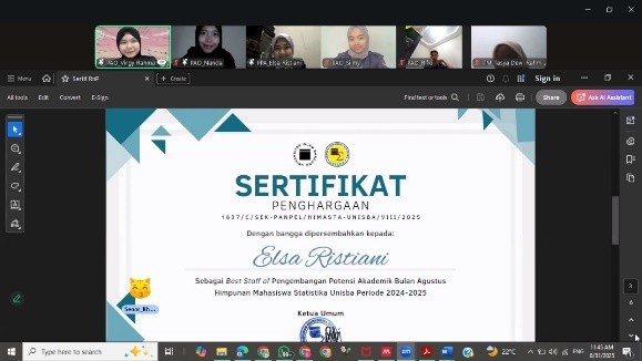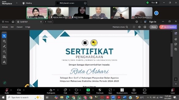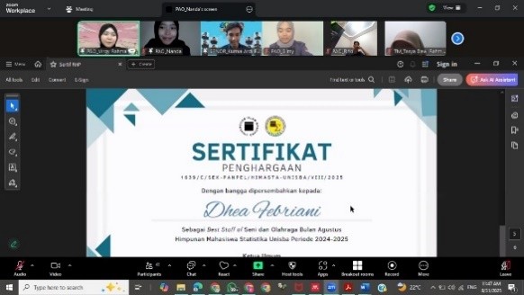 Untuk Reward and Punishment ketiga telah dilaksanakan pada 31 Agustus 2025 secara online melalui Zoom Meeting. Pada pelaksanaan Reward and Punishment keempat, berikut adalah pengurus dari masing-masing bidang yang berhasil meraih penghargaan sebagai Best Staff Bidang di Himasta berdasarkan akumulasi penilaian dari indikator yang telah ditentukan: