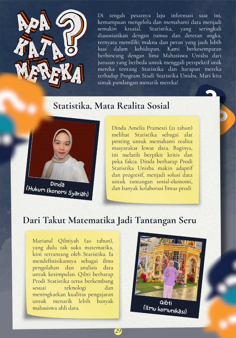 Selain artikel utama yang inspiratif, edisi ke-14 juga menampilkan profil mahasiswa berprestasi, kisah pengalaman magang di berbagai perusahaan, serta beragam rubrik menarik seputar lifestyle, enterpreneurship, hiburan, dan dunia kampus. Semua dikemas dengan gaya ringan namun tetap informatif, menjadikan Statistics Magazine bukan sekadar bacaan, melainkan sumber inspirasi bagi generasi muda yang ingin berpikir kritis dan inovatif.