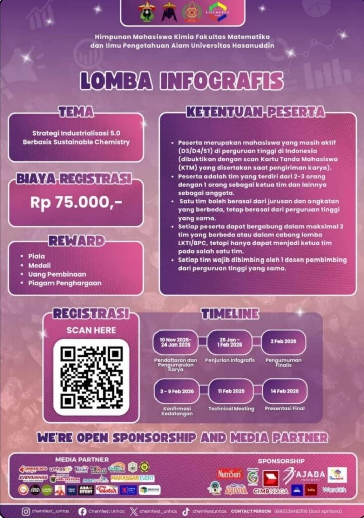 Jan72026Lomba Link Pendaftaran : https://bit.ly/Chemfest2026 Link Buku Panduan: https://bit.ly/Chemfest2026 Dipublikasikan atas kolaborasi dengan Bidang Pengembangan Potensi Akademik Category: LombaBy Humas Himasta7 Januari 2026Tags: FMIPA UNISBAhimastahimasta unisbaInfo LombaStatistika UnisbaUniversitas Islam Bandung Author: Humas Himasta Post navigationPreviousPrevious post:Kompetisi Infografis MahasiswaNextNext post:PAPER COMPETITION 2026Related PostsPAPER COMPETITION 20267 Januari 2026Kompetisi Infografis Mahasiswa7 Januari 2026Olimpiade Matematika 267 Januari 2026ANAVA #207 Januari 2026AKLAMASI 20267 Januari 2026