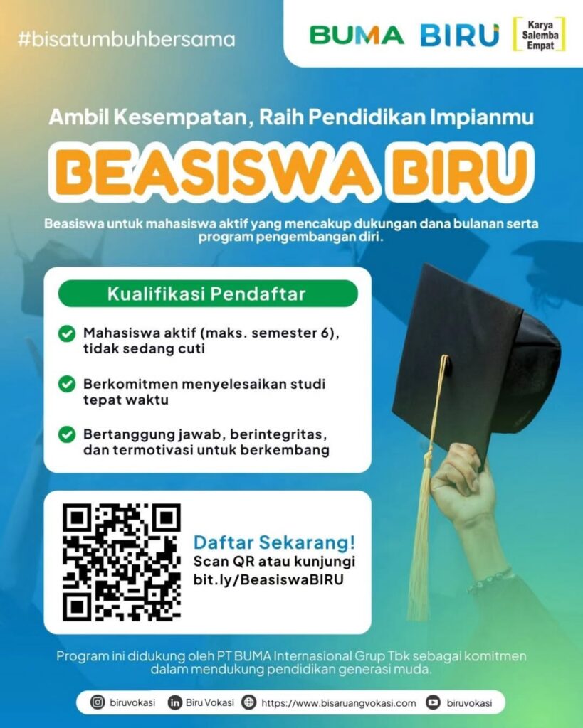 Feb62026Beasiswa Link Pendaftaran: https://bit.ly/BeasiswaBIRU Dipublikasikan atas kolaborasi dengan Bidang Pengembangan Potensi Akademik Category: BeasiswaBy Humas Himasta6 Februari 2026Tags: BeasiswaFMIPA UNISBAhimastahimasta unisbainfo beasiswamipaSTAMPStatistikaStatistika UnisbaunisbaUniversitas Islam Bandung Author: Humas Himasta Post navigationPreviousPrevious post:Company Visit 2026 [GUIDEBOOK]NextNext post:Beasiswa DataPrint 2026Related PostsBeasiswa Rosyid Ridho6 Februari 2026Beasiswa DataPrint 20266 Februari 2026Beasiswa Pendidikan Pemimpin Indonesia #47 Januari 2026Beasiswa Cendekia Muda #47 Januari 2026