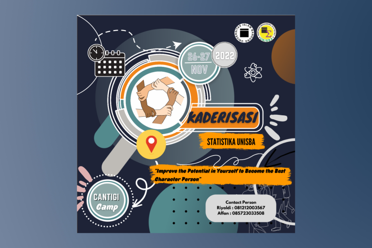 Assalamu’alakum Wr. Wb Halo Statistician!?? Apa kabar nih? Semoga sehat selalu ya. Kaderisasi 2022 akan segera dilaksanakan dengan tema “Improve the Potential in Yourself to Become the Best Character Person”. Kaderisasi merupakan kegiatan pengembangan dan pengupayaan pembentukan seorang kader dengan tujuan mengenalkan Keluarga Besar Statistika Universitas Islam Bandung kepada Mahasiswa Baru Program Studi Statistika angkatan…